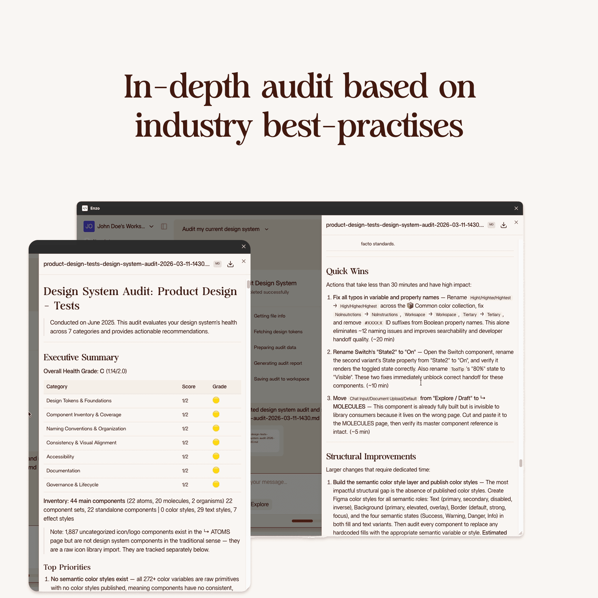 Open your Figma project in Enzo and ask it to audit your design system. Wait two to four minutes. Read the markdown report. Start with the quick wins.