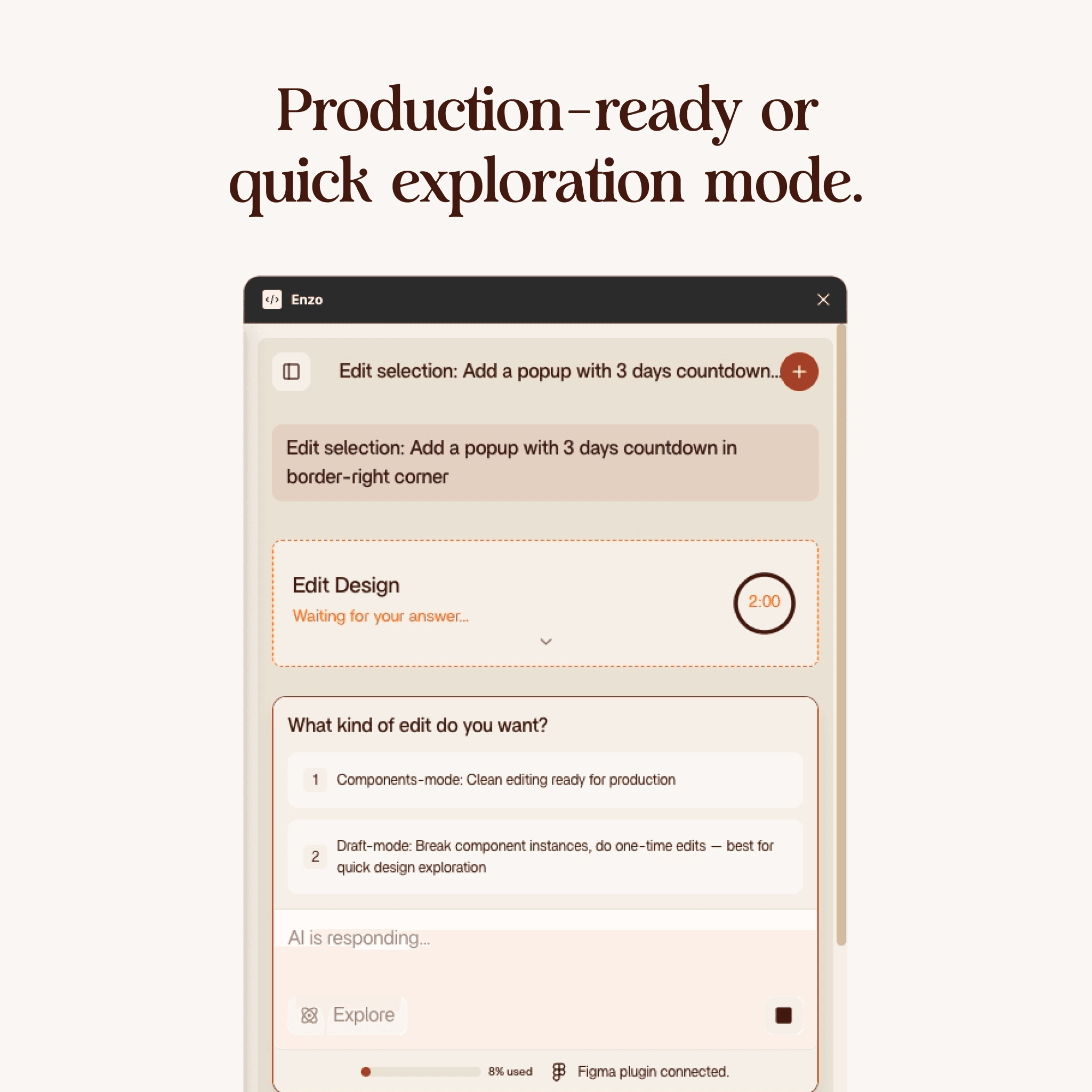 - Applies the edits directly to your frame in Figma. Real layers, real components, real Auto Layout.