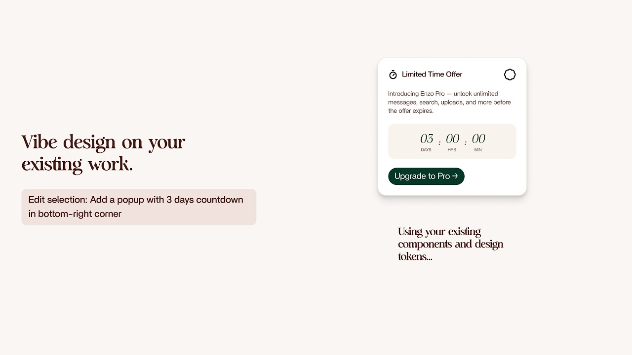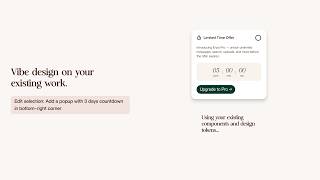 Select a frame in Figma. Write a prompt describing what you want. "Add a popup with a three day countdown in the bottom right corner." "Replace the sidebar with a collapsible menu." "Add a notification banner at the top."
